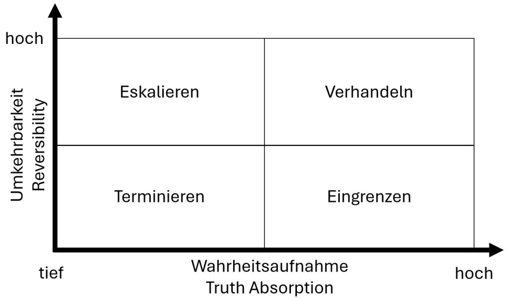 - Niedrige Truth Absorption + niedrige Reversibility → Eskalation, Selbsttäuschung, Death March