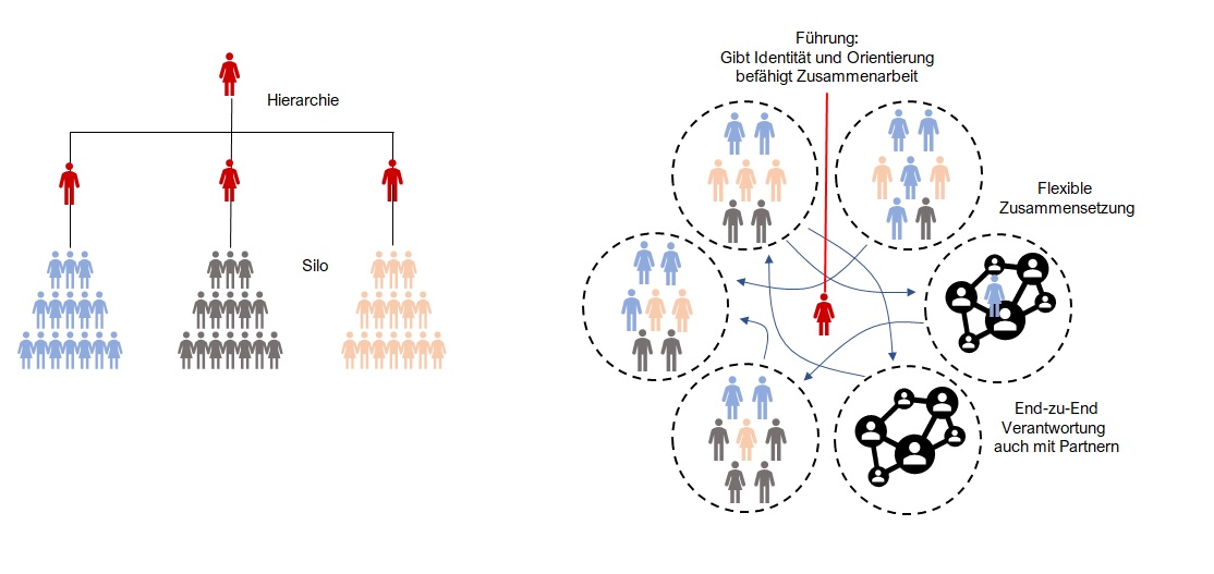 Für die Führung geht es weniger darum die Planung des Silos zu unterstützen, sondern Identität und Orientierung zu geben. Es ist die Aufgabe der Führung die Zusammenarbeit zu befähigen. Ihre Rolle, ist diejenige eines Botenstoff in einem Organismus. Und ganz wichtig, es ist Ihre Aufgabe die Zukunftsfähigkeit des Organismus sicherzustellen. Für das Gesamt-System und jeden Einzelnen.
