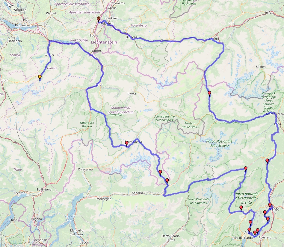 Anstelle eines WoS, gibt es heute nur einen kleinen Blick auf die Motorrad-Route des Wochenendes, gut 800 km. Schön machbar, wenn man am Freitagabend in St. Moritz oder Umgebung ist.