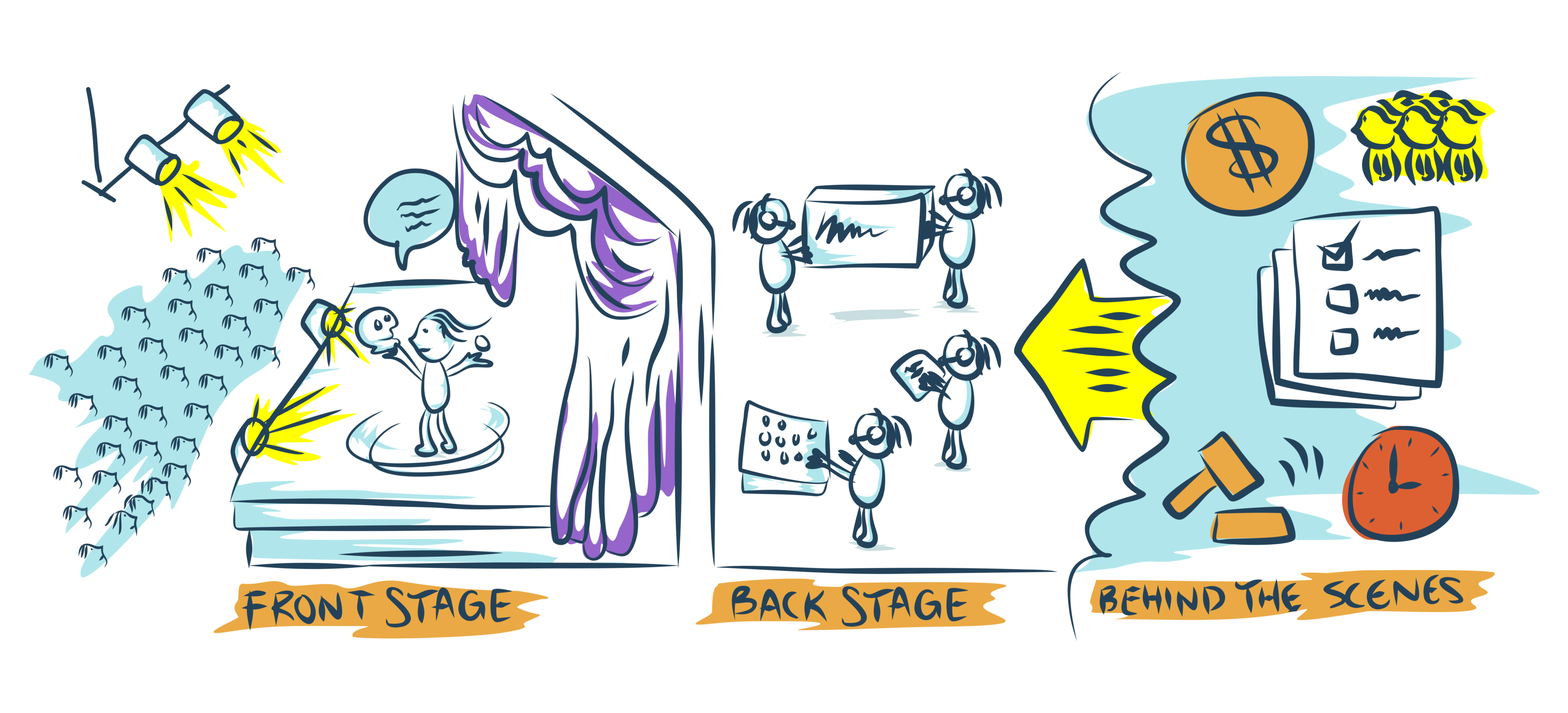 Die resultierende Matrix erlaubt es, den Fluss der Aktionen, die jede Rolle entlang des Prozesses durchführen muss, darzustellen, wobei die Aktionen, die der Benutzer sehen kann (in unserem Bild: Front Stage) und die, die im Back-Office geschehen (bei uns: Back Stage), hervorgehoben werden. Rollen können von Menschen oder anderen Elementen ausgeführt werden (Behind the Scene).