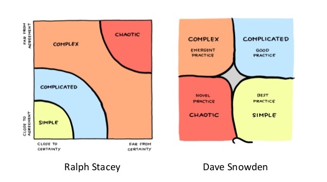Dazu gibt es verschiedene Modelle, sei es nun Ralph Stacey oder Dave Snowden und das Cynefin Modell. Es gäbe noch ältere Modelle, wie die Dynaxabilität aus dem Jahre 1991. Gemein ist allen Modellen, dass es verschiedene Bereiche gibt: