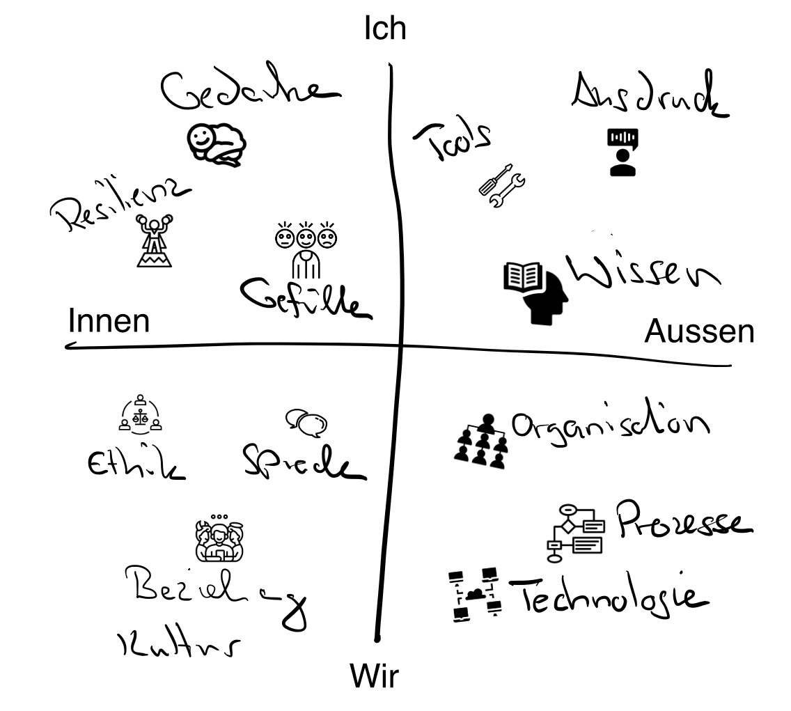 Gerade jetzt wären eine gute Beziehungskultur und starke Team- und Gruppen-Beziehungen wichtig, um uns mehr Resilienz zu geben. «Du bist nicht allein». Daneben helfen auch ganz einfache Dinge, wie Video-Sitzungen, die nur noch 50 Minuten gehen, damit man gut Zeit hat zum nächsten Call. Den Raum um Dinge zu erledigen, die beim Treffen von Home auf Office so anstehen. Dazu gehört auch das Vertrauen, dass man seine Arbeit auch über einen längeren Tageszeitraum verteilen kann. Oder wenn der Ausdruck und die Sprache zusammenpassen. Es geht darum das Leben wie es ist anzunehmen. Um mir die Wichtigkeiten der Elemente zu zeige, habe ich die Elemente mal in einen Kontext gestellt.