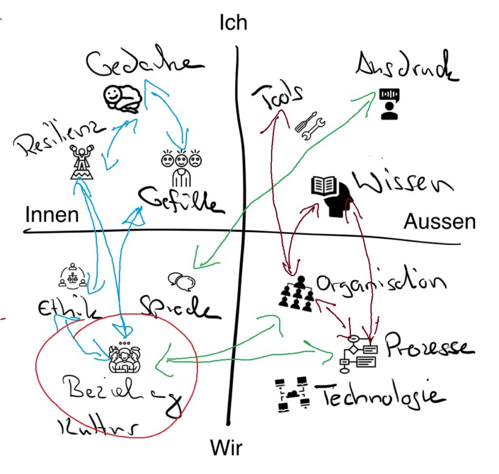 Oben meine Zusammenhänge zwischen den einzelnen Themen innerhalb und ausserhalb der Quadranten. Für mich ergibt sich, dass eine gute Beziehungskultur am wichtigsten ist, da mit ihr am meisten verbunden ist. Und die Technologie in diesem zweiten Lockdown am wenigsten veiträgt. Sie wurde wirklich schon erledigt. Was ist also eine gute Beziehungskultur? Und was hilft gute Führung dazu.