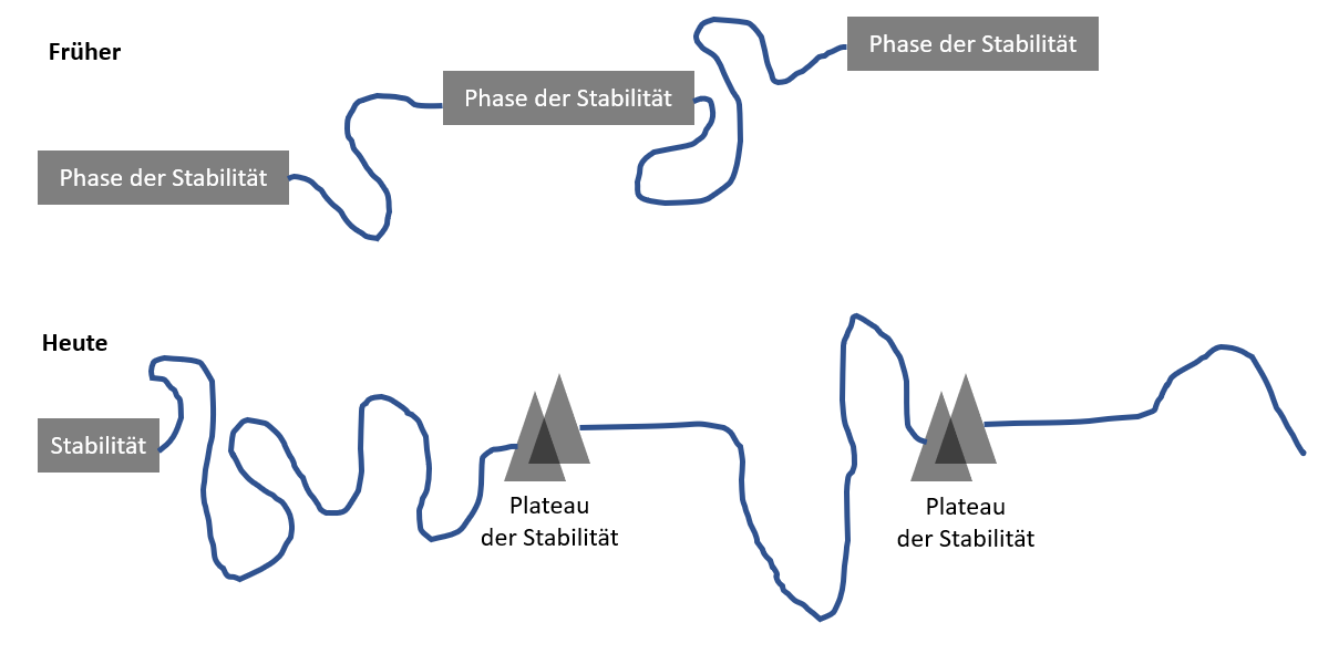 Dieses Bild wird immer mehr untergraben durch die Möglichkeiten, die sich ergeben. Heute ist die «Welt ein Dorf». Heute sind wir dauernd im Change. Um mit Change besser umzugehen, suchen wir immer wieder gerne den «grossen Plan«. Vielleicht sollten wir unser Bild «drehen», Stabilität ist nur noch eine kurze Phase, welche uns Zeit gibt von einer Change Phase in die nächste zu gelangen und dort dank agilem Umgang das Beste für uns und unsere Umwelt herauszuholen.