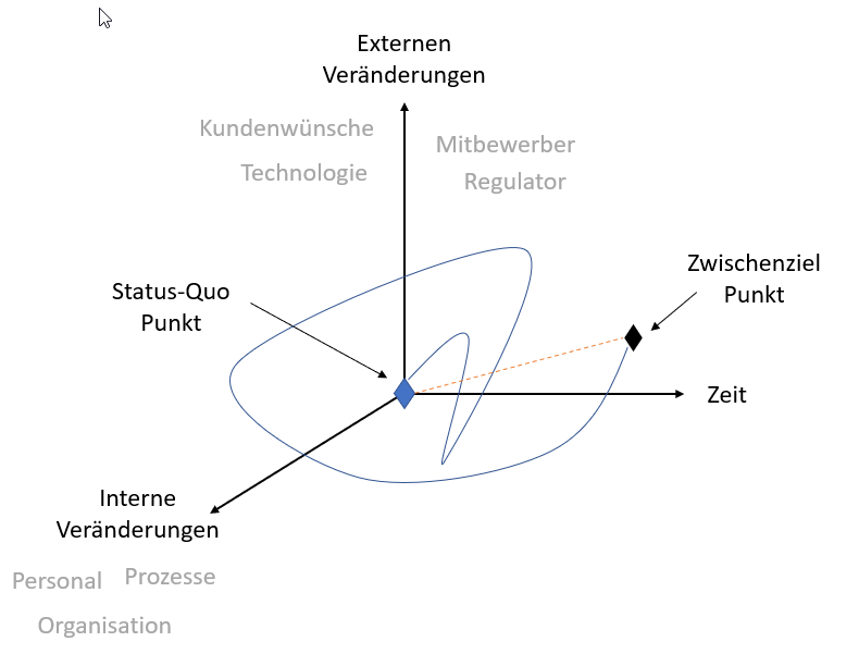 Aufgrund der Komplexität, welche die soziale oder menschliche Komponente dieser Veränderungsprozesse mit sich führt, wirken sie oft kaum fassbar. Tatsächlich aber können solche Veränderungen in der Retroperspektive ganz eindeutig und klar aufgezeigt werden. Wie die orange Linie in der Grafik, das wäre der optimale Weg vom Status-Quo zum neuen Zwischenziel gewesen. Auf der Reise hat sich dieser Punkte aber immer wieder bewegt und mit ihm auch unser Weg dorthin.