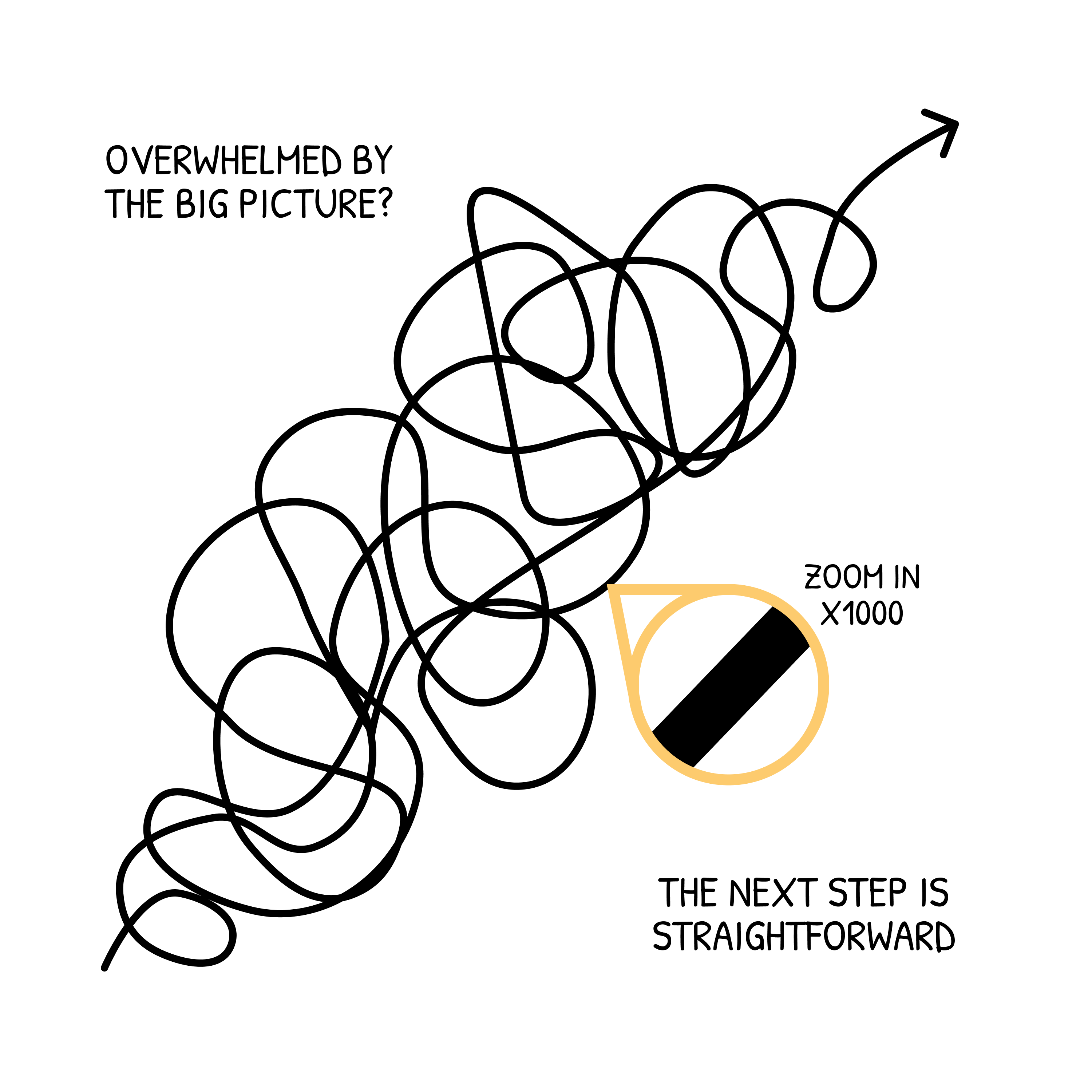 Die grösste Herausforderung in der heutigen Zeit, ist der Fakt, dass der «grosse Plan» meistens ein ziemlich langer Weg ist, der selten auf einer Geraden verläuft. Dabei ist es, dass was wir gerne suchen. Einen nächsten Schritt, der wenn möglich flach und gerade aus geht. Das scheint eine machbare Aufgabe zu sein. Folgendes Bild zeigt einen sehr guten Weg damit umzugehen: