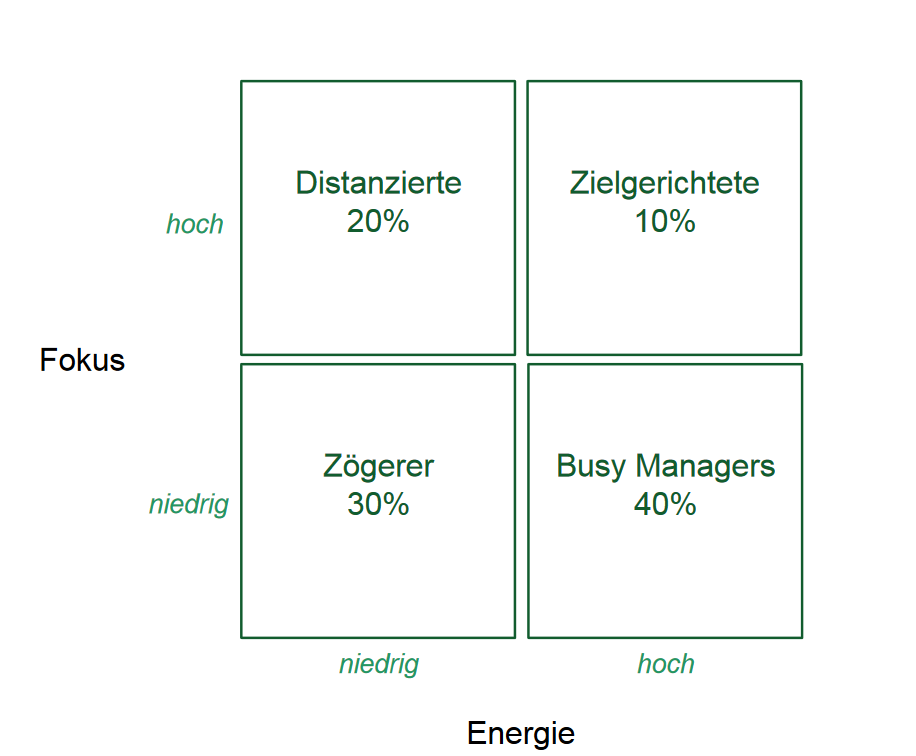 Wer die Fokus-Energie-Matrix von Heike Bruch kennt, sieht hier eine Übersetzung auf das Management. Bei 50% der Führungskräfte ist der Energie Level hoch, aber nur 10% davon haben auch einen hohen Fokus. Das heisst, sie stellen sich primär relevanten Themen. Während viele Vorgesetzte viel Energie investieren, aber weniger Fokus haben und eher Dinge tun, die sie gut können.