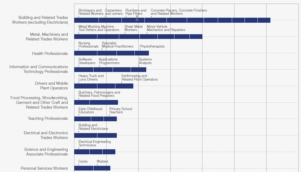 Daraus stellt sich die Frage: Wo fehlen schon heute Leute? Hier die grössten Bereiche, wo in Europa Leute fehlen. Vor allem im Handwerk, der Industrie und dem Gesundheitsbereich fehlen schon heute Leute.