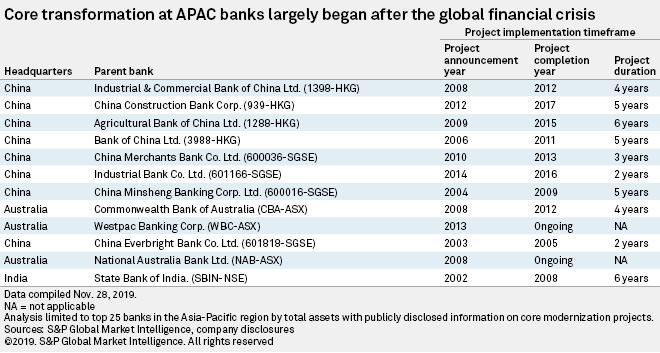 Interessanterweise erneuern Banken in China ihre Kernsysteme häufiger. Nachfolgend eine Grafik aus dem folgenden Bericht: APAC Banks Seek Rewards Of Core System Modernization. Die gute Neuigkeit, es dauert auch in China meistens 3 bis 5 Jahre, um ein Core Banking System abzulösen. Bei den meisten Banken dort geht es neben der Systemerneuerung auch um die Bereitstellung von Skaleneffekten in den Systemen. Der Modeausdruck dort ist die «Progressive Modernisierung«, weil der Komplett-Austausch eben schon sehr teuer ist.