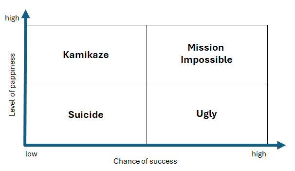 Und dann kommt diese Einteilung. Und jedem wird klar, dass «Mission Impossible» sehr schön sein kann, während Kamikaze dann wohl nur noch glücklich macht. Besonders schätze ich auch, dass es mit Ugly und Suicide noch zwei Quadrate gibt. Wie immer bei einer 4×4 Matrix ist oben rechts erstrebenswert und unten links nicht.