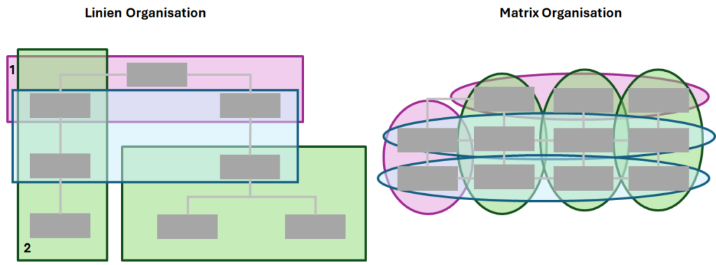 In einer Matrix Organisation kann die Aufgabe noch ein wenig mehr Komplexität haben. Während die Team-Struktur einfacher wird, hat die Führungsdimension je nach Ausprägung eine grössere Komplexität zu haben.