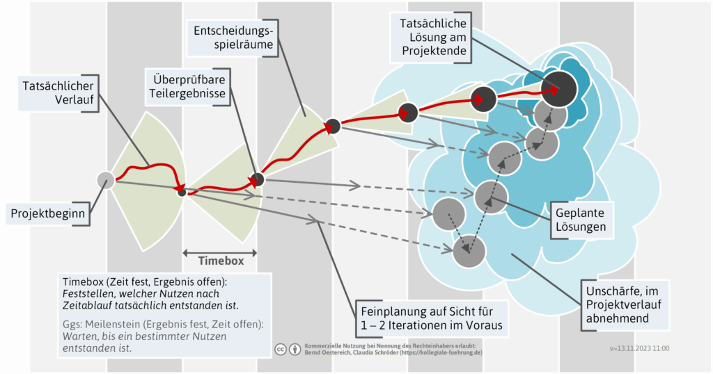 - Entscheidungsspielräume: In jeder Timebox, welche ich bei Strategie-Entwicklung eher bei 6 Monaten ansetzen würde, als bei zwei Wochen, geht es darum, aus den möglichen Optionen eine oder mehrere Auszuwählen und diese via überprüfbare Teilergebnisse zu beweisen.