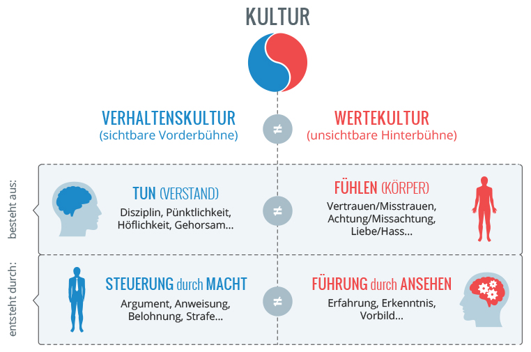 Die Begrifflichkeit hat es mir sehr angetan. Denn die Kultur eines Unternehmens hat eine sichtbare Vorderbühne und eine unsichtbare Hinterbühne. Die Vorderbühne besteht aus dem Verhalten der Mitarbeitenden. Nur dieses kann direkt beobachtet werden.